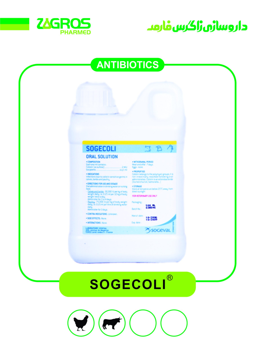 گوساله‌ و بره‌: ۵۰۰۰۰ واحد بین‌المللی‌ به‌ ازای‌ هرکیلوگرم‌ وزن‌ بدن‌ هر ۱۲ ساعت‌ یک‌ بار به‌ مدت‌ ۳ تا ۴روز در آب‌ آشامیدنی‌ یا مخلوط‌ با غذای‌ مایع‌، معادل‌۲۵/۰ میلی‌لیتر از محلول‌ سوژیکلای‌ برای‌ ۱۰ کیلوگرم‌وزن‌ زنده‌، روزی‌ ۲ بار به‌ مدت‌ ۳ تا ۴ روز.